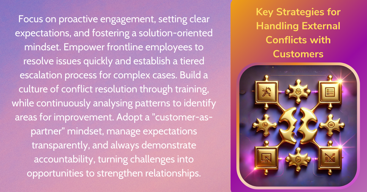 - Train teams to remain calm, patient, and empathetic during difficult conversations and show them how to remain consistent in their approach. Developing a culture that values conflict resolution as a learning opportunity fosters trust and reinforces long-term customer relationships.